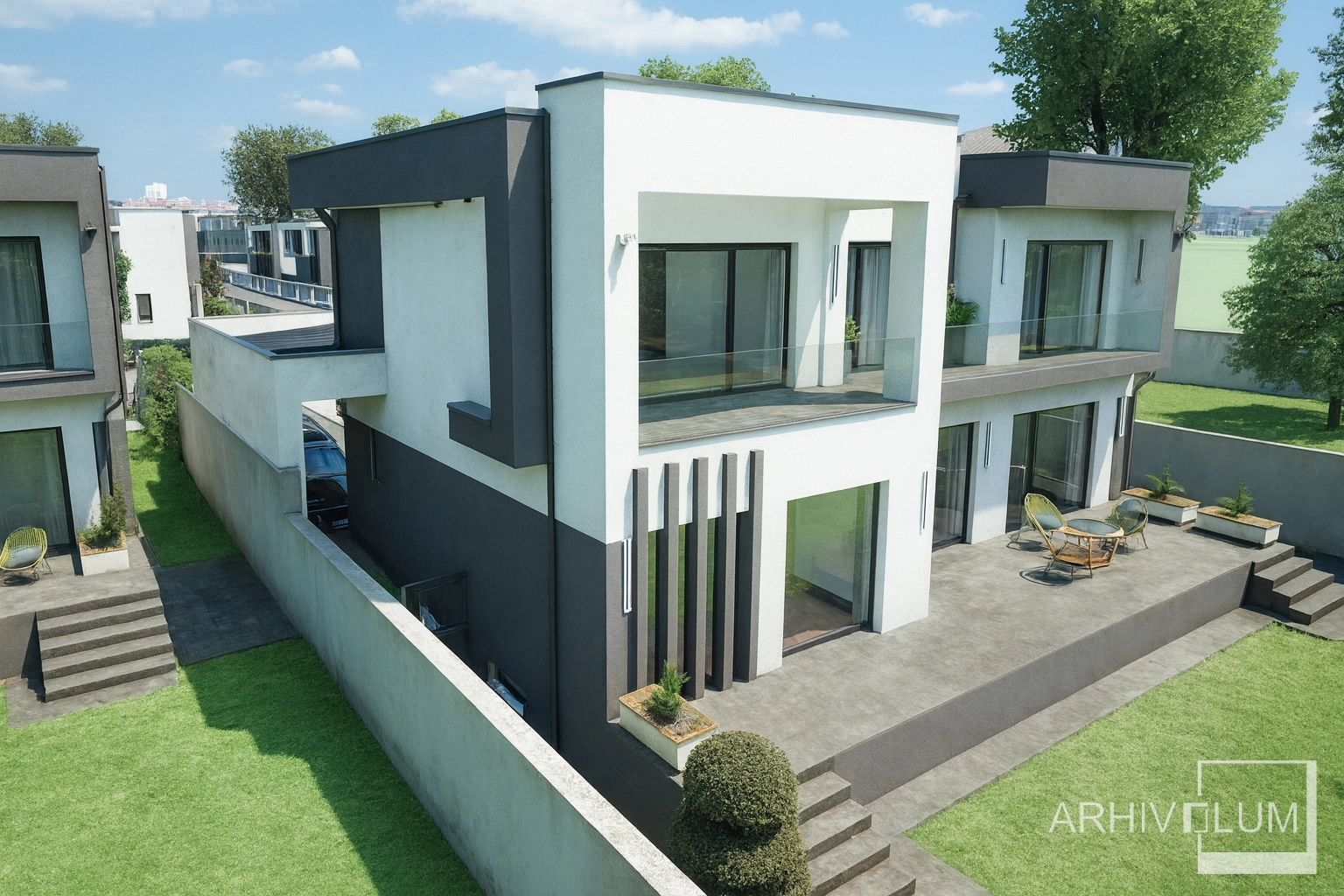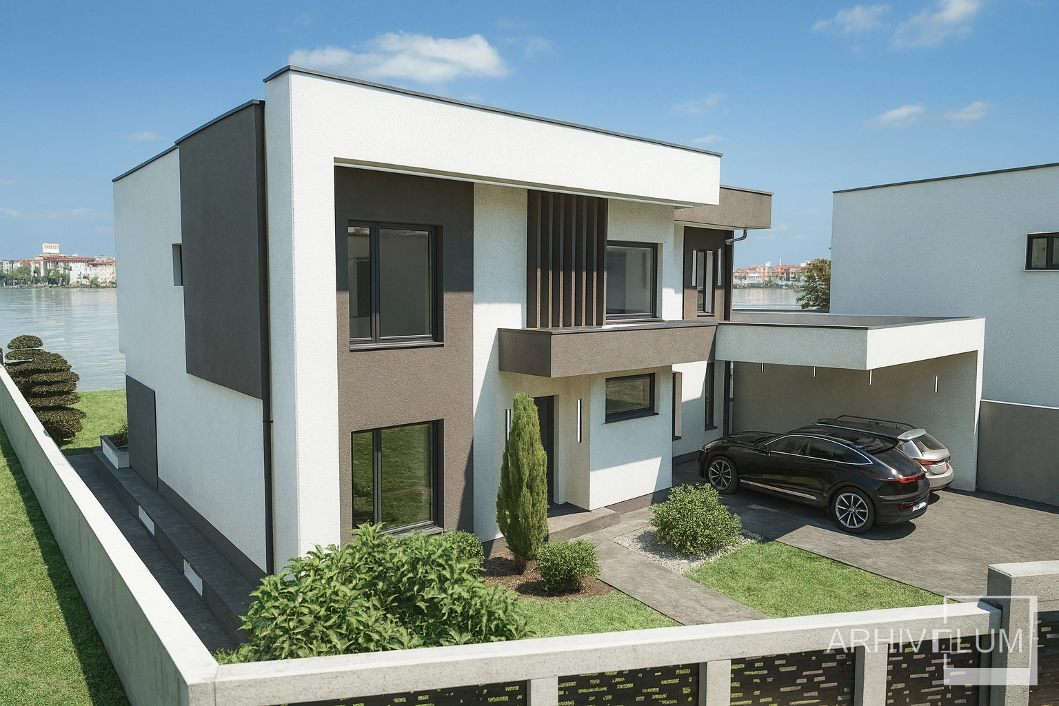 Terenul în ușoară pantă a condus spre o amenajare cu terasamente si amplasarea unei piscine spre malul lacului. Terasa circulabilă, copertinele de beton armat, balcoanele si parcarea deschisă pentru 2 autoturisme susțin acest tip de arhitectură modernă. În suprafața desfășurată nu sunt incluse scarile de la intrare, terasele descoperite de la parter și etaj și copertinele din beton armat. Construcția va fi realizată in anul 2026 si face parte dintr-un mic cartier cu 25 de locuinte.