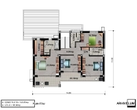 Etajul, cu casa scării frumos luminată de geamul mare dublat de riflaje este compus din patru dormitoare generoase, iar dormitorul matrimonial are dressing și baie proprie. Pentru o mai bună comunicare cu natura dar și între membrii familiei, toate dormitoarele au acces către terasa elegantă și generoasă. Suprafețele mari vitrate pentru fiecare dormitor, accesul nestingherit la terasa comună, băile spațioase și circulația verticală cu lumina specială crează un sentiment de libertate și confort pentru oricine și-ar dori o astfel de locuință. Acest tip de locuință, prin soluționarea riguroasă a spațiilor poate fi construit și pe un teren plat.