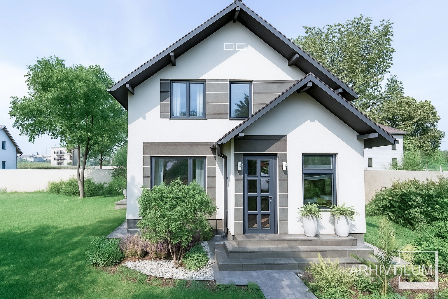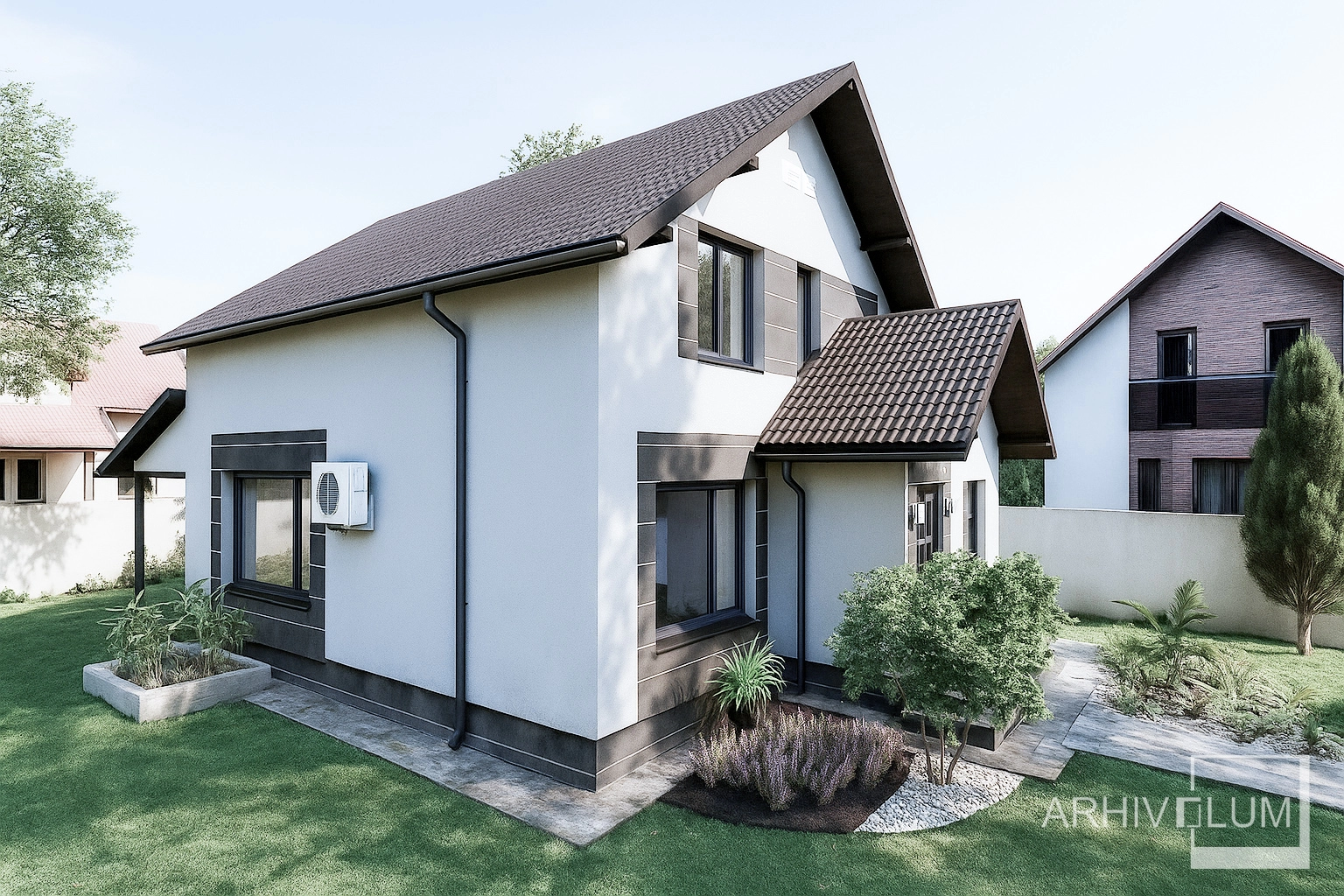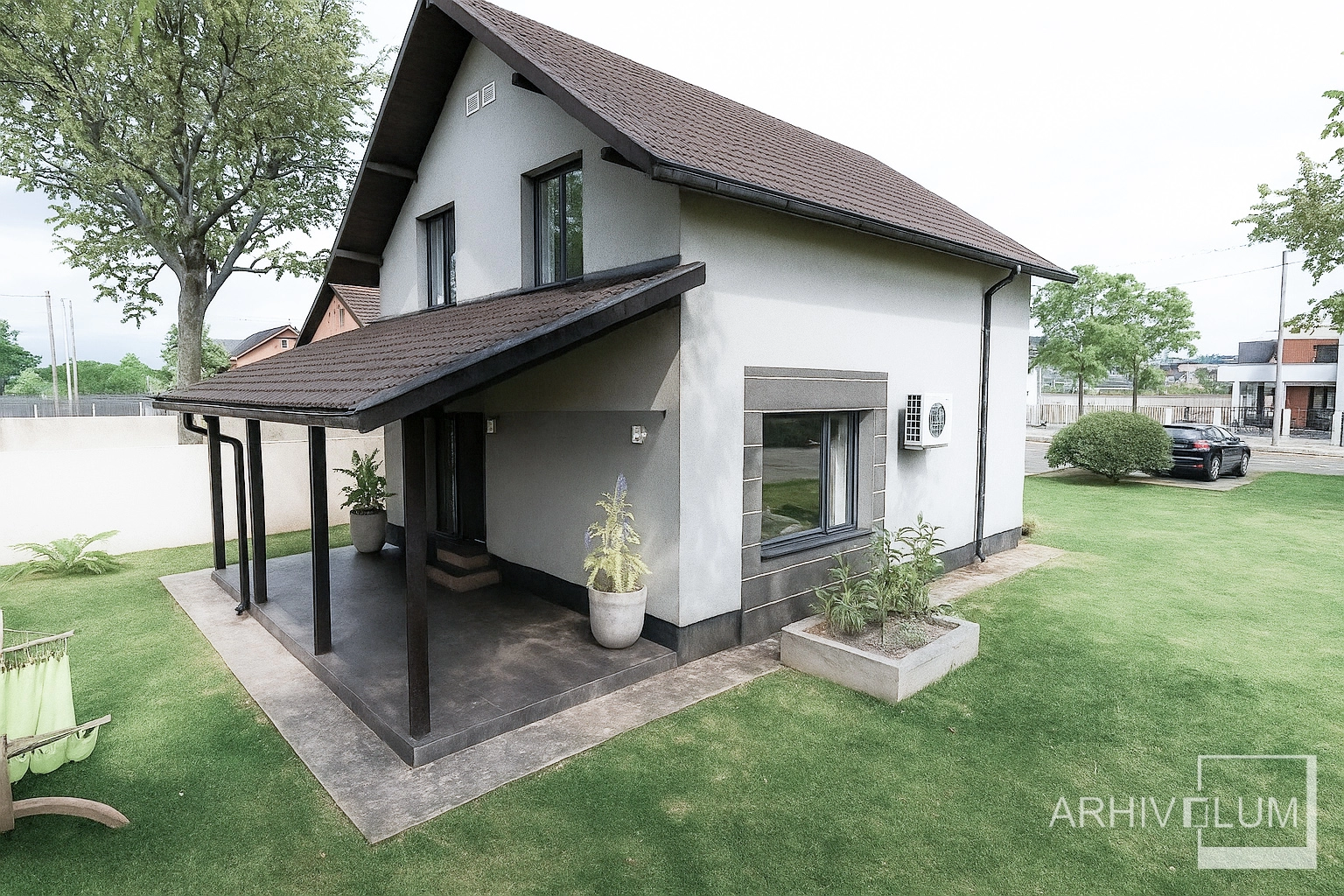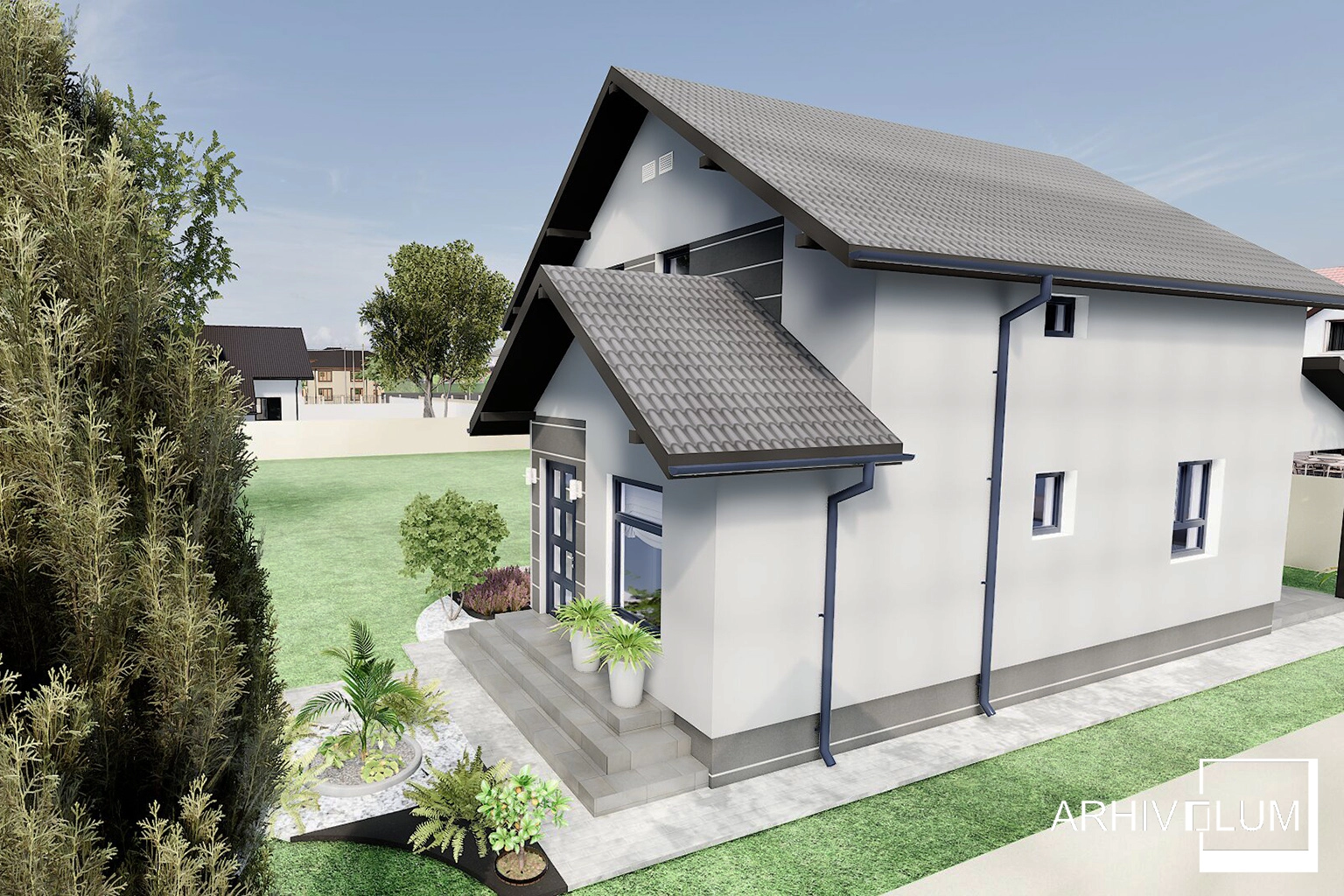 Locuința a fost gândită pentru mediul rural și satisface toate cerințele minime pentru traiul la țară sau poete deveni oricând o frumoasă locuință de vacanță. Casa are un vestibul de lemn pentru a minimiza costurile de execuție, iar în spatele construcției s-a amenjat o terasă acoperită din lemn, structură ce poate fi închisă cu termopane oricând se dorește.